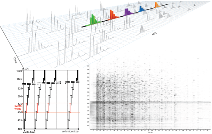 SWATH-MS is an alternative data-independent acquisition technique in mass spectrometry that allows the collection and storage of the fragmentation spectra of virtually all peptides in a sample. In the process, preselected isolation mass windows are specified and fragmentation of all precursor ion species contained is performed in an efficient, unbiased manner, independent of their abundance. This results in co-fragmentation of simultaneously eluting and close isobaric ion species and generates highly complex MS/MS spectra, which need to be deconvoluted by peptide-centric data analysis approaches. In a peptide-centric analysis, a spectral ion library, also referred to as a SWATH or assay library, is used to extract ion chromatograms in a targeted manner using DIA tools such as OpenSWATH, PeakView or Spectronaut. Comprehensive, high-quality assay libraries support the identification and the consistent and accurate quantification of thousands of peptides representing large fractions of the proteome.